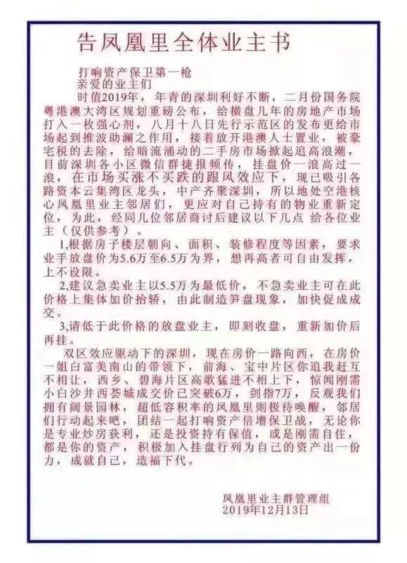 近日,福海街道中糧鳳凰里花苑小區(qū)個別業(yè)主發(fā)布集體漲價言論,涉嫌惡意炒作二手房價,以下為網(wǎng)傳業(yè)主倡議書
