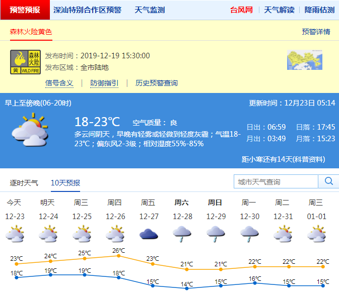 深圳方面,預(yù)計(jì)周一至周四我市多云為主,早晚有輕霧或霾,氣溫緩慢回升,周一氣溫18-23℃。