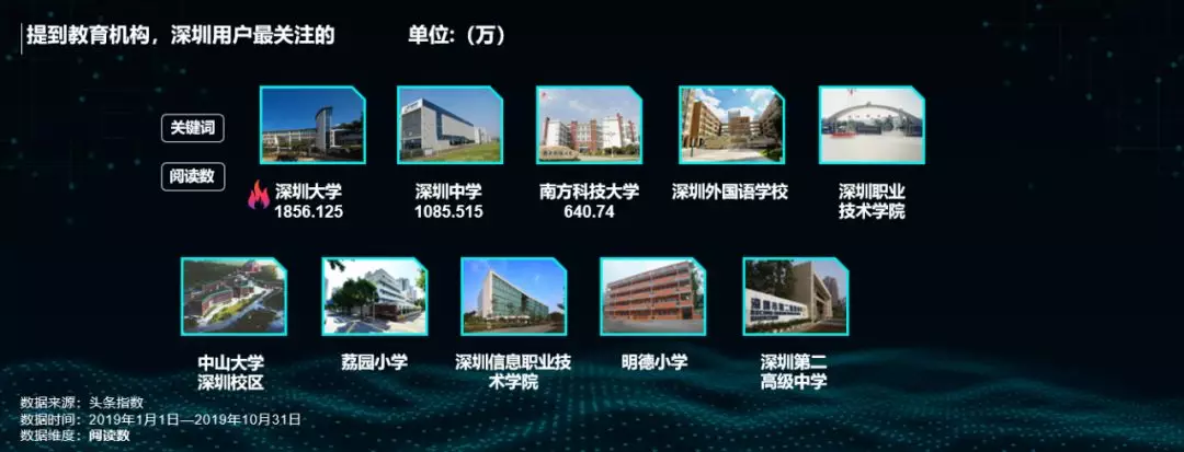 數(shù)據(jù)顯示,深圳大學(xué)、深圳中學(xué)和南方科技大學(xué)這三所教育機構(gòu)最受深圳網(wǎng)友關(guān)注。今年深圳在補齊教育短板上的力度繼續(xù)加大,尤其是在《意見》支持深圳在教育體制改革方面先行先試,高標(biāo)準(zhǔn)辦好學(xué)前教育,擴大中小學(xué)教育規(guī)模,高質(zhì)量普及高中階段教育,充分落實高等學(xué)校辦學(xué)自主權(quán),加快創(chuàng)建一流大學(xué)和一流學(xué)科,打造現(xiàn)代職業(yè)教育體系后,深圳教育的進步發(fā)展,未來可期。