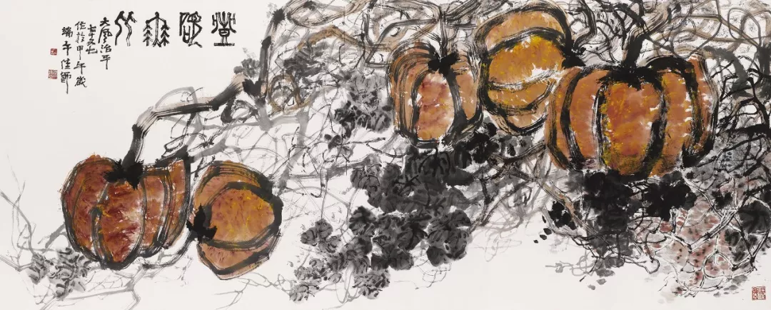魏治平的畫(huà),尤以藤類見(jiàn)長(zhǎng),構(gòu)圖奇異,筆酣墨飽,瓜果菜蔬鳥(niǎo)蟲(chóng)魚(yú),無(wú)一不獨(dú)出心裁,氣象崢嶸,水墨淋漓之間極富創(chuàng)作精神,他筆下的南瓜、紫藤、凌霄、葡萄等更有齊白石、吳昌碩之風(fēng),自成一派,奔放不離法度,神微孕育氣魄。
