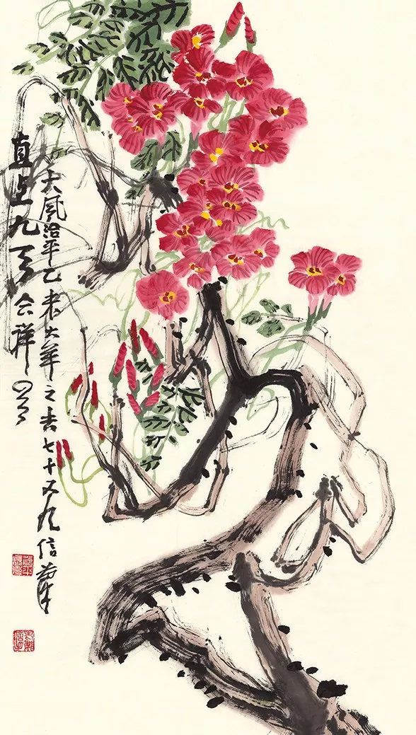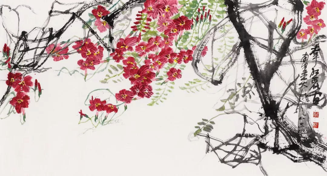 記者在魏治平的工作室看到,他創(chuàng)作的凌霄每一幅都有所不同,不僅畫(huà)出了凌霄花的千姿百態(tài),還呈現(xiàn)了凌霄根、藤、葉的獨(dú)特風(fēng)姿。葉茂花紅、根老彌壯、藤連天下,每一幅凌霄都代表了魏治平作為藝術(shù)家對(duì)國(guó)家的美好祝福。在此次展覽上,觀眾也能看到魏治平最新創(chuàng)作的凌霄。