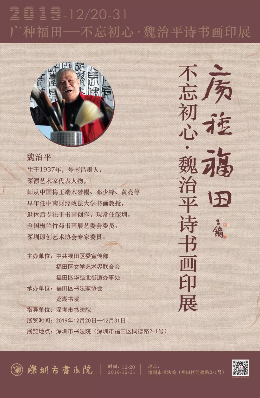 12月20日至12月31日,“廣種福田不忘初心——魏治平詩(shī)書(shū)畫(huà)印展”在深圳市書(shū)法院展出。年過(guò)八十的魏治平,仍筆耕不輟,堅(jiān)持攀登藝術(shù)高峰,不斷創(chuàng)作。本次展覽除了展出他多年創(chuàng)作的詩(shī)書(shū)畫(huà)印精品,還會(huì)展出他今年的最近佳作。