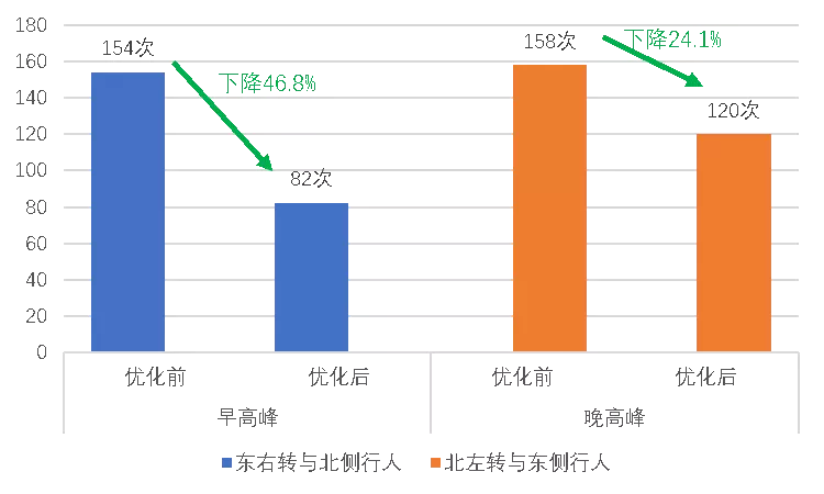 高新南十道/高新南環(huán)東路口人車(chē)交織次數(shù)最大由154次下降至82次,降幅46.7%;晚高峰路口通過(guò)量提升最大,由原來(lái)2221pcu/提升至2424pcu/h,提升13.7%