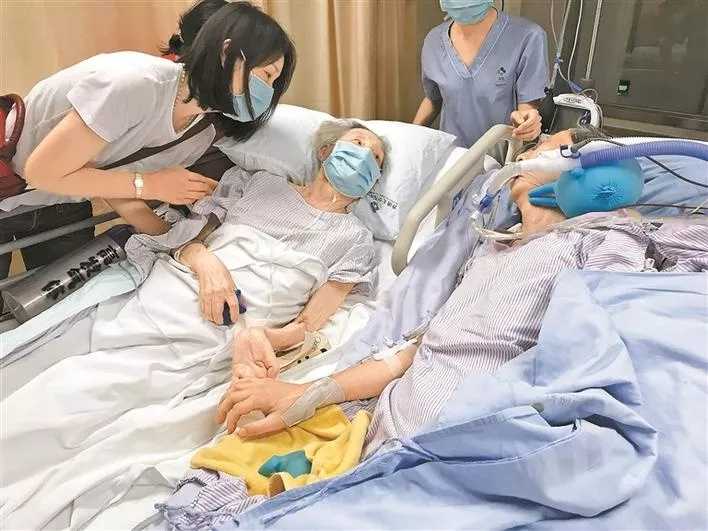 7月27日20點48分,香港大學深圳醫(yī)院的ICU病房里,兩位病重的老人的手握在了一起。在并排擺放的兩張病床上躺著的,是一對攜手恩愛57年的耄耋伉儷——高先生和彭女士。這兩位都已病重住院的老人,完成了或許是他們?nèi)松械淖詈笠幻?。這一幕,讓病床邊的許多親屬和醫(yī)務人員都淚流滿面。