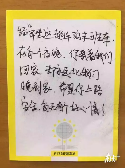 紙條上寫著:“經(jīng)常坐這趟車的末班車,在每個夜晚,你載著我們回家,卻永遠比我們晚到家,希望你上路安全,每天有個好心情!”