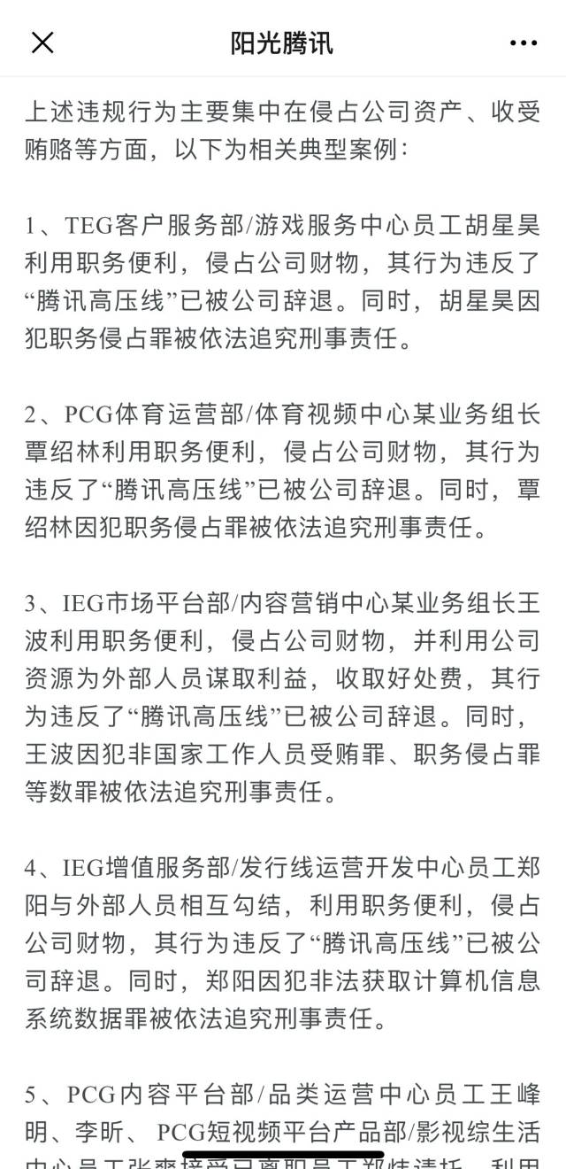 5、PCG內(nèi)容平臺(tái)部/品類運(yùn)營(yíng)中心員工王峰明、李昕、 PCG短視頻平臺(tái)產(chǎn)品部/影視綜生活中心員工張爽接受已離職員工鄭煒請(qǐng)托,利用職務(wù)便利為鄭煒謀取利益,收取好處費(fèi),該三人的行為違反了“騰訊高壓線”已被公司辭退。同時(shí),王峰明、李昕、張爽、鄭煒?biāo)娜艘蛏嫦臃缸?,已被移送公安機(jī)關(guān)。