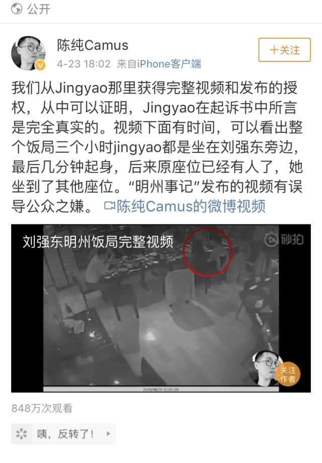 4月23日,微博賬號(hào)“陳純Camus”對(duì)劉強(qiáng)東飯局發(fā)布視頻,圖為頁(yè)面截圖。