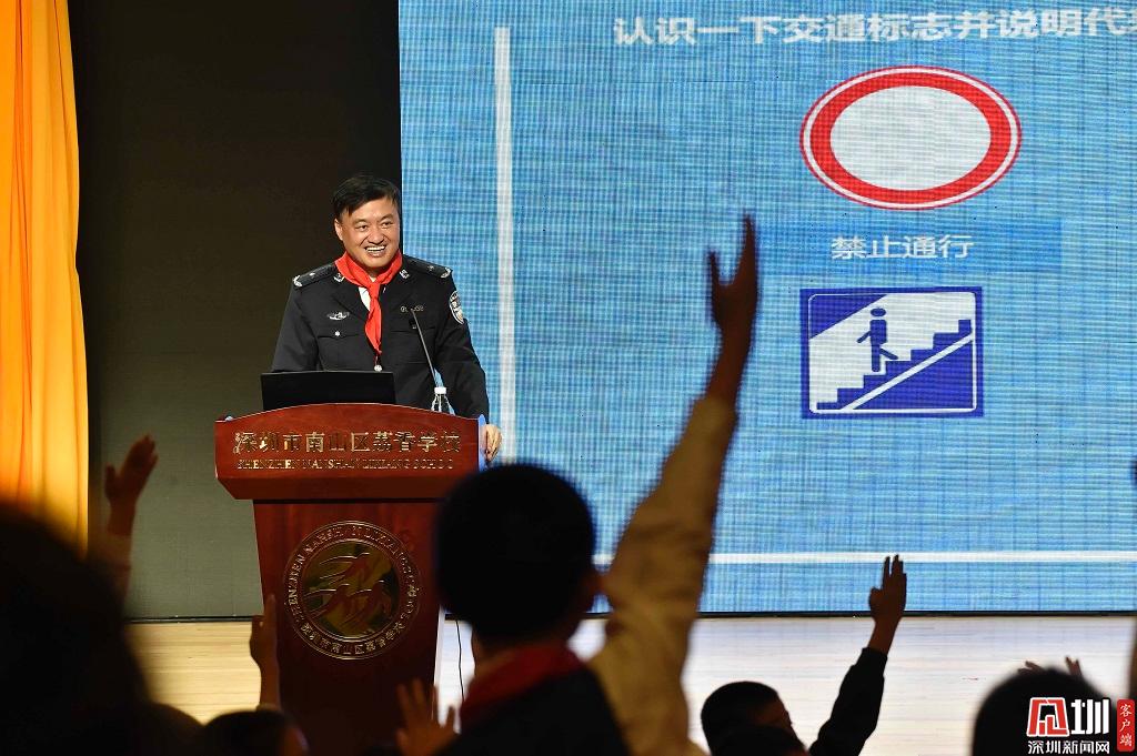 2019年2月20日,南山區(qū)荔香學(xué)校,市交警局局長徐煒正在向?qū)W生們講述交通安全知識。為加強2019年度新學(xué)期校園交通安全宣傳工作,深圳交警聯(lián)合市教育局在新學(xué)期開學(xué)期間,在全市范圍開展“交通安全教育第一課”授課活動。