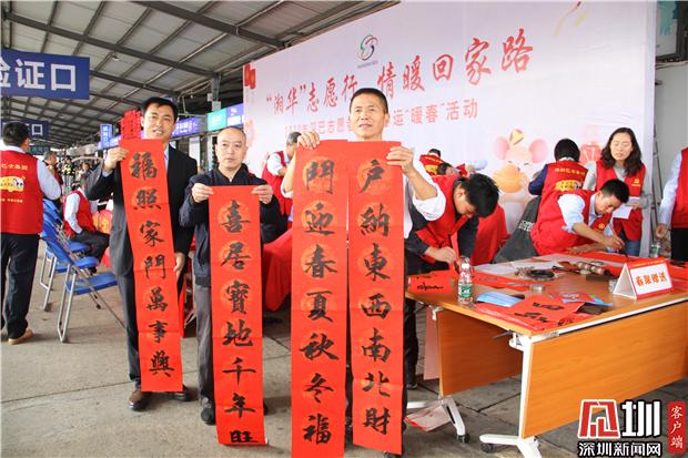 深圳巴士集團(tuán)志愿者現(xiàn)場寫春聯(lián)贈(zèng)給返鄉(xiāng)旅客。