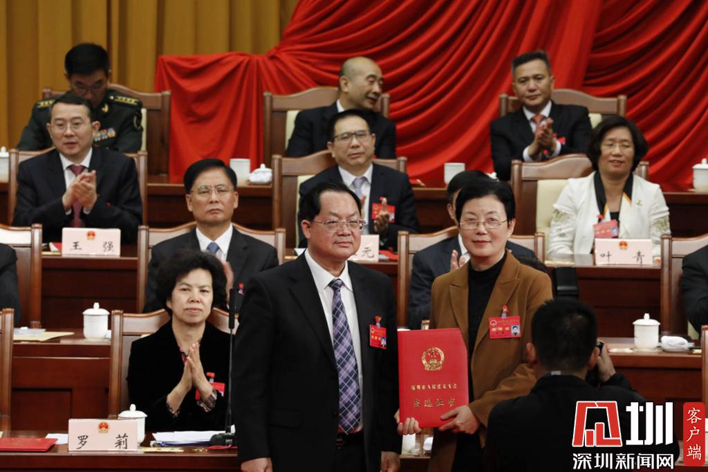 深圳市人大常委會主任駱文智(左)為新當(dāng)選的市人大常委會副主任裴蕾(右)頒發(fā)當(dāng)選證書。