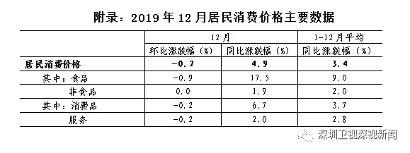 2019年12月份,深圳居民消費(fèi)價(jià)格(CPI)環(huán)比下降0.2%,較上月低0.7個(gè)百分點(diǎn);CPI同比上漲4.9%,漲幅較上月收窄0.1個(gè)百分點(diǎn)。1-12月,深圳居民消費(fèi)價(jià)格較上年同期上漲3.4%。