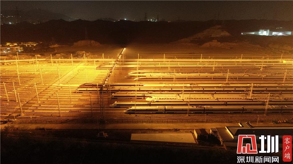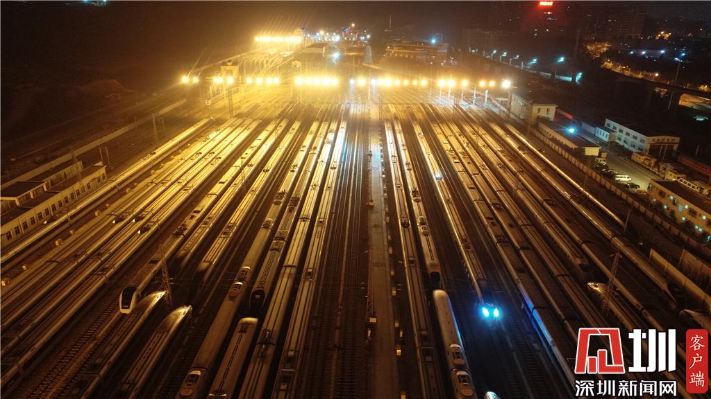 1月15日凌晨,深圳動(dòng)車運(yùn)用所內(nèi)的存車庫航拍畫面。