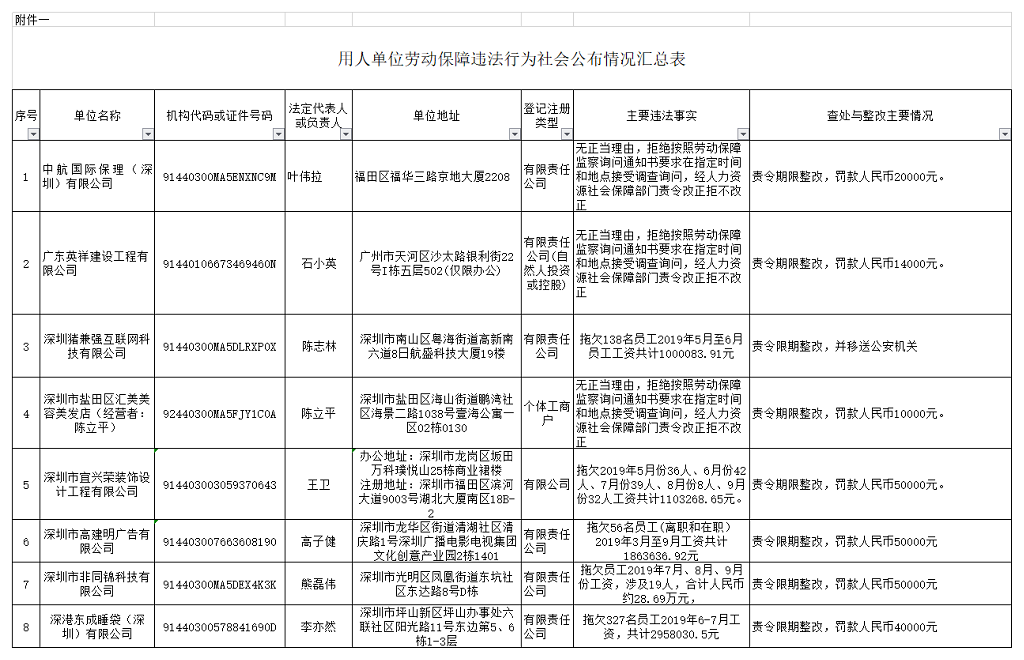 2019年第四季度,深圳市人力資源部門繼續(xù)加大對欠薪等勞動保障違法行為的打擊力度,依法處罰,對涉嫌犯罪的堅(jiān)決移送司法機(jī)關(guān),切實(shí)維護(hù)勞動者的合法權(quán)益。為加強(qiáng)對違法用人單位的社會監(jiān)督,強(qiáng)化誠信體系建設(shè),加大威懾力,深圳市人力資源和社會保障局依據(jù)《廣東省用人單位重大勞動保障違法行為社會公布暫行規(guī)定》和《深圳市勞動保障違法信息公布辦法》,日前部分區(qū)(新區(qū))人力資源部門查處的一批勞動保障違法案件予以公布。