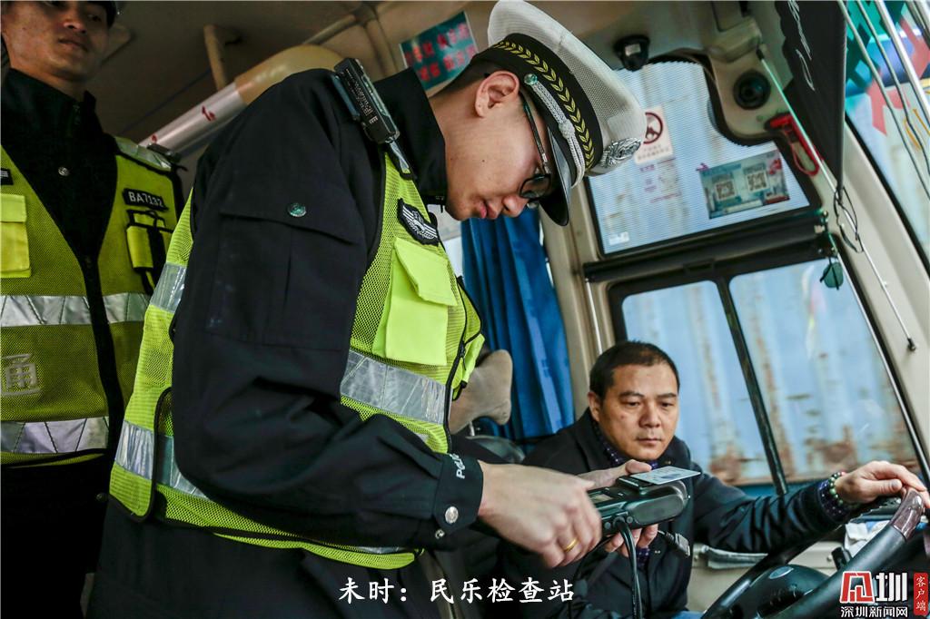 未時(shí):下午14時(shí)50分左右,一名深圳交警民警對(duì)一輛營(yíng)運(yùn)客車司機(jī)進(jìn)行檢查。