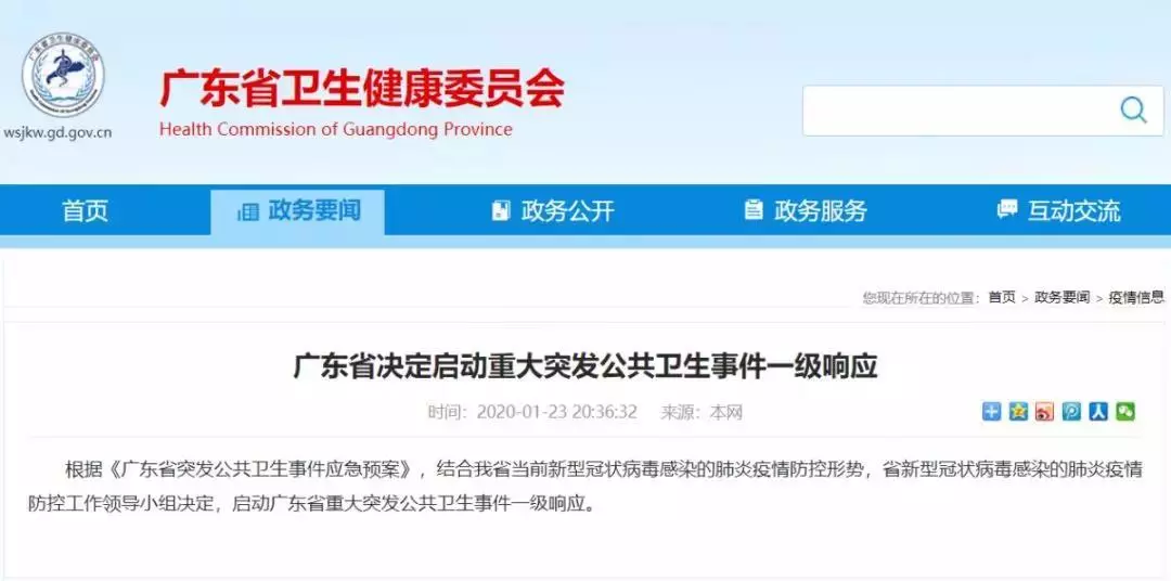 廣東省衛(wèi)健委1月23日晚發(fā)布通告:根據(jù)《廣東省突發(fā)公共衛(wèi)生事件應(yīng)急預(yù)案》,結(jié)合我省當(dāng)前新型冠狀病毒感染的肺炎疫情防控形勢(shì),省新型冠狀病毒感染的肺炎疫情防控工作領(lǐng)導(dǎo)小組決定,啟動(dòng)廣東省重大突發(fā)公共衛(wèi)生事件一級(jí)響應(yīng)。