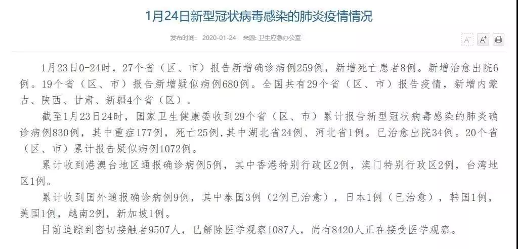 國家衛(wèi)建委通報:1月23日0-24時,27個?。▍^(qū)、市)報告新增確診病例259例,新增死亡患者8例。新增治愈出院6例。19個?。▍^(qū)、市)報告新增疑似病例680例。全國共有29個?。▍^(qū)、市)報告疫情,新增內蒙古、陜西、甘肅、新疆4個?。▍^(qū))。