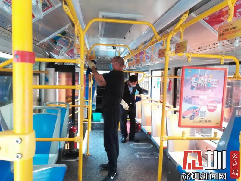 深圳巴士集團(tuán)屬下公交線路,工作人員正在對公交車廂進(jìn)行消毒。