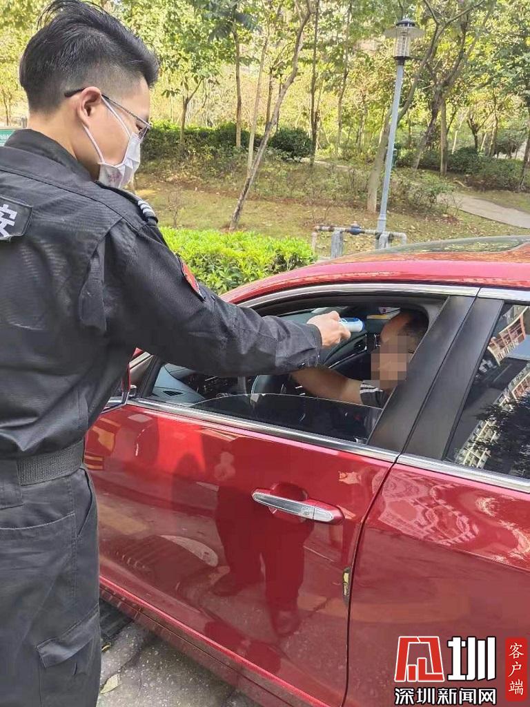 保安對進(jìn)出小區(qū)車主進(jìn)行體溫測量。