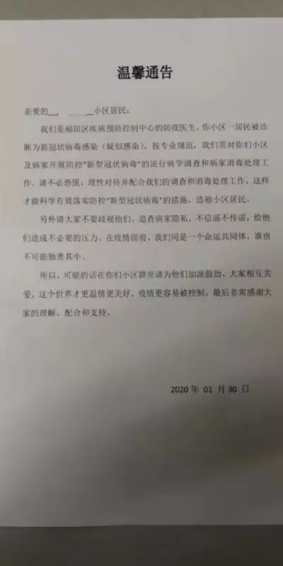 1月30日,由于深圳一小區(qū)出現(xiàn)新冠狀病毒疑似感染病例,福田區(qū)疾病預(yù)防控制中心的防疫醫(yī)生發(fā)布了這則通告。通告除了呼吁小區(qū)居民配合調(diào)查及消毒處理工作外,還特地懇請(qǐng)大家“不要歧視,在疫情面前,我們是同一個(gè)命運(yùn)共同體,誰(shuí)也不可能獨(dú)善其身。”不知為何,雖不是湖北人也未曾受過歧視,但還是被這寥寥數(shù)字的“請(qǐng)求”溫暖了。