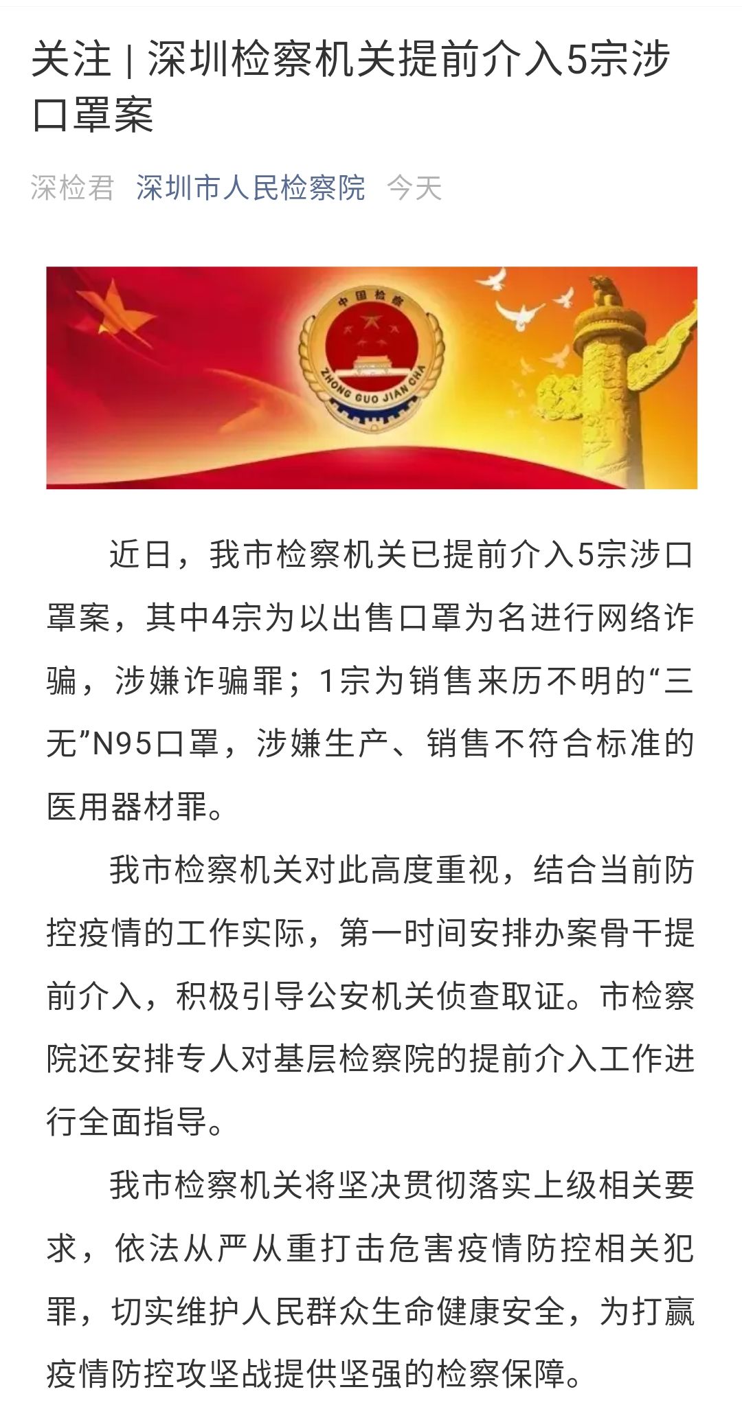 深圳檢察機關(guān)提前介入5宗涉口罩案 涉及詐騙和銷售三無產(chǎn)品