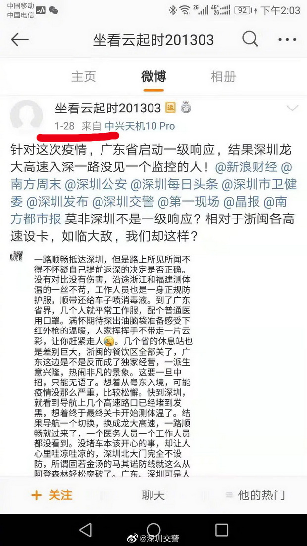 1月28日,有網(wǎng)友在社交軟件上稱深圳“不設防”,龍大高速無檢疫點。