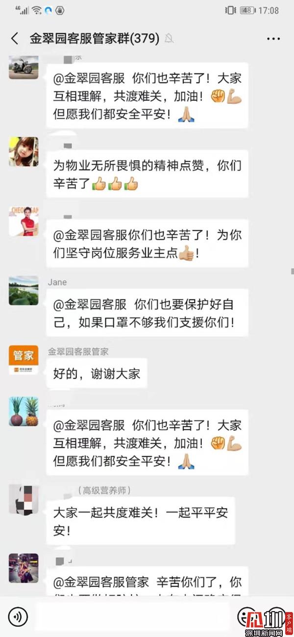 小區(qū)物業(yè)管理處主任鄒菊彬表示,目前小區(qū)每天進(jìn)行3次全面消殺,包括地面、電梯、樓道等多個位置。他表示,小區(qū)內(nèi)已張貼《新型冠狀病毒感染的肺炎相關(guān)知識和個人防護(hù)》等防護(hù)指引和宣傳資料。物業(yè)工作人員向還未返深的住戶進(jìn)行了宣傳解釋,消除恐慌。對返深的小區(qū)住戶已做好詳細(xì)信息登記,對居家醫(yī)學(xué)觀察的住戶每天兩次隨訪,并經(jīng)常給他們送一些生活用品?!拔覀兊墓ぷ魅藛T已經(jīng)把電話留給他們,有啥需要幫忙的可以隨時聯(lián)系”,他說到。