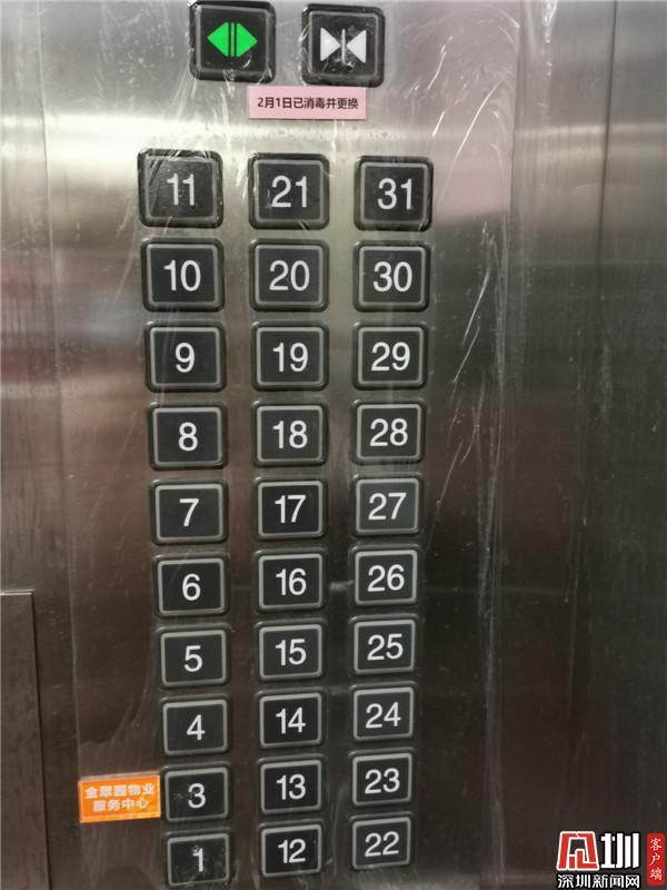 電梯摁鍵貼上了保鮮膜并注明當(dāng)天已消毒。