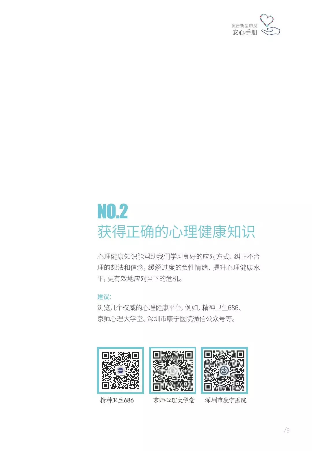 抗擊新型肺炎“安心手冊”由深圳市精神衛(wèi)生中心/深圳市康寧醫(yī)院支持,深圳市康寧醫(yī)院始建于1980年,是深圳市唯一一家集預(yù)防、醫(yī)療、康復(fù)、科研、教學(xué)于一體的公立三甲精神病??漆t(yī)院。2010年以來,醫(yī)院連續(xù)九年名列復(fù)旦大學(xué)醫(yī)院管理研究所中國最佳??婆判邪窬駥?漆t(yī)院前十位;2017年榮膺第五屆全國文明單位;2019年精神科獲評廣東省高水平臨床重點???。醫(yī)院服務(wù)在各類顧客體驗度和公眾滿意度測評中,名列前茅。