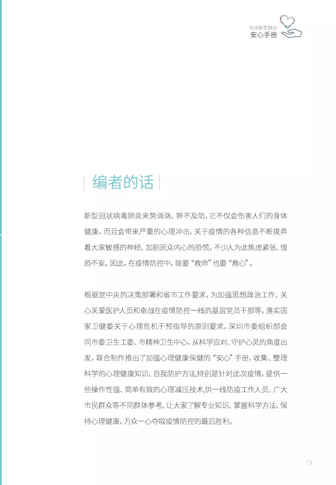 根據(jù)黨中央的決策部署和省市工作要求,為加強思想政治工作、關(guān)心關(guān)愛醫(yī)護(hù)人員和奮戰(zhàn)在疫情防控一線的基層黨員干部等,落實國家衛(wèi)健委關(guān)于心理危機干預(yù)指導(dǎo)的原則要求,深圳市委組織部會同市委衛(wèi)生工委、市精神衛(wèi)生中心,從科學(xué)應(yīng)對、守護(hù)心靈的角度出發(fā),聯(lián)合制作推出了加強心理健康保健的“安心”手冊,收集、整理科學(xué)的心理健康知識、自我防護(hù)方法,特別是針對此次疫情,提供一些操作性強、簡單有效的心理減壓技術(shù),供一線防疫工作人員、廣大市民群眾等不同群體參考,讓大家了解專業(yè)知識、掌握科學(xué)方法、保持心理健康,萬眾一心奪取疫情防控的最后勝利。