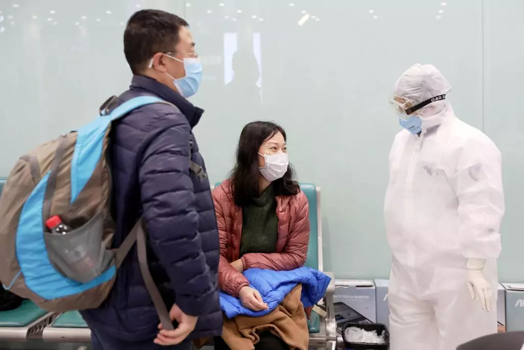 在機(jī)場(chǎng)檢疫站旁,醫(yī)務(wù)人員對(duì)旅客進(jìn)行詢問(wèn)和醫(yī)學(xué)健康篩查。