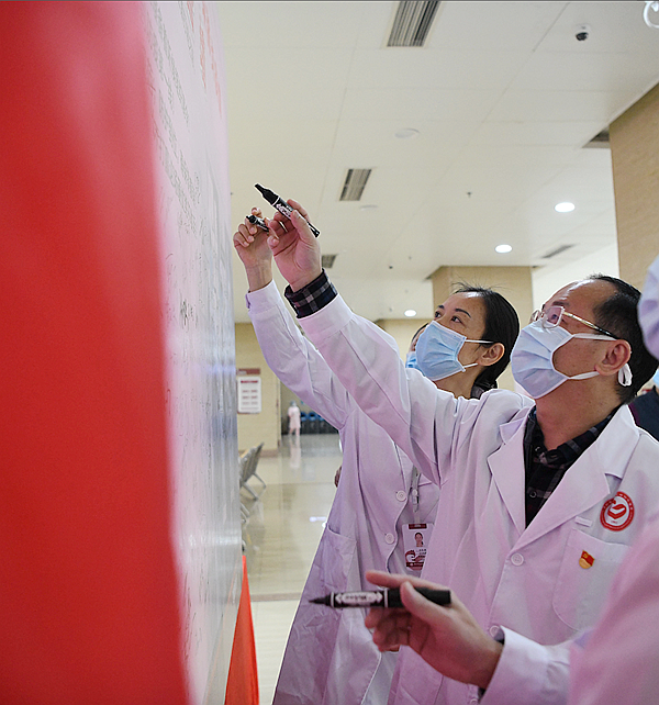 在整個(gè)疫情阻擊戰(zhàn)中,龍崗區(qū)婦幼保健院黨組織自始至終都發(fā)揮著不可替代的先鋒模范作用,在疫情剛開始的時(shí)候,以曹樂勝院長為首的醫(yī)院黨委就身先士卒緊急行動(dòng)起來迅速投入到抗病毒戰(zhàn)斗中去。院黨委發(fā)出了通知,號召廣大員工積極行動(dòng)起來,投身疫情防控第一線,全院人員迅速響應(yīng),截止2月3日,報(bào)名人數(shù)達(dá)369人,其中黨員112人。醫(yī)院組織了部分代表參加的宣誓儀式,大家激情滿懷地舉起右手,莊嚴(yán)承諾:我將堅(jiān)守初心,勇?lián)姑?;無條件服從大局,時(shí)刻準(zhǔn)備著聽候組織調(diào)令;立志沖鋒在前,誓到防疫第一線;我必履職盡責(zé),嚴(yán)守規(guī)范,防護(hù)到位,確保零感染;保證與病毒戰(zhàn)斗到底,不打贏這場硬仗絕不收兵。