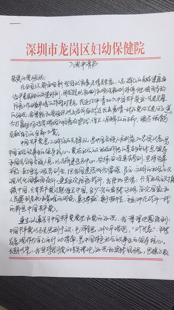 從學(xué)生時(shí)期的書本和電影,到長大后的生活和工作,特別是最近疫情防控的時(shí)間里,一樁樁、一件件事情都讓羅小金心緒難平,他經(jīng)過反復(fù)思考,多次和黨組織談心,最后以飽滿的熱情和謙恭的態(tài)度、崇敬的心情,提起手中的筆,一筆一劃,親手書寫了入黨申請書和請戰(zhàn)書,他在請戰(zhàn)書上寫道:“我深知這次疫情時(shí)間緊,任務(wù)重,所以我志愿申請加入最接近病毒的病毒核酸檢測組,加入抗擊新型冠狀病毒感染肺炎的一線,為贏得這場戰(zhàn)役而戰(zhàn)斗!”他說不想用電腦打印,一定要親筆書寫,才能寫出自己的心聲。(深圳新聞網(wǎng)記者 張凡 通訊員 譚旭東)