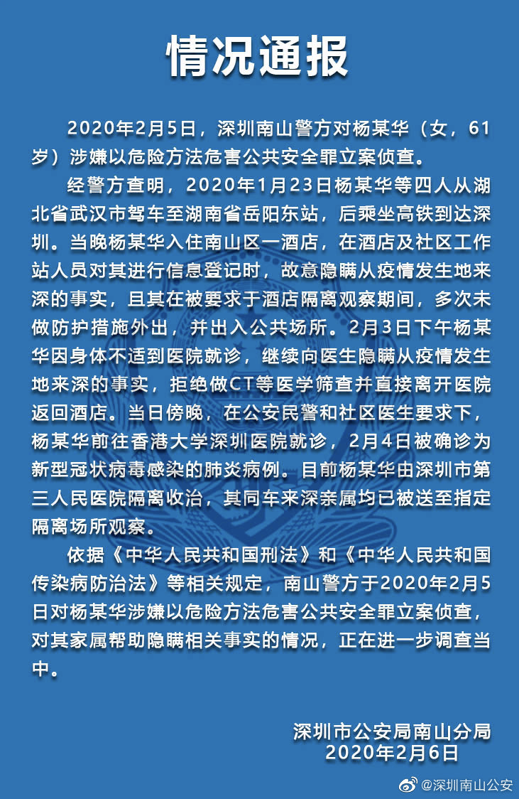 依據(jù)《中華人民共和國(guó)刑法》和《中華人民共和國(guó)傳染病防治法》等相關(guān)規(guī)定,南山警方于2020年2月5日對(duì)楊某華涉嫌以危險(xiǎn)方法危害公共安全罪立案?jìng)刹椋瑢?duì)其家屬幫助隱瞞相關(guān)事實(shí)的情況,正在進(jìn)一步調(diào)查中。