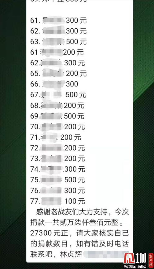 “各位戰(zhàn)友,現(xiàn)在疫情形勢(shì)如此嚴(yán)峻,正是需要我們排憂解難的時(shí)候,我們不能袖手旁觀,現(xiàn)向戰(zhàn)友們發(fā)起防護(hù)口罩捐助倡議……”早在2月2日,林貞輝便在翠竹街道退役軍人微信群里發(fā)起捐款倡議。捐款的倡議一發(fā)出,便得到熱烈響應(yīng),退役軍人們紛紛在群里接龍捐款:200元、300元、500元……微信群里的捐款數(shù)字不斷累加,不到一天的時(shí)間,便籌集到來(lái)自76位退役軍人的愛心善款27300元。