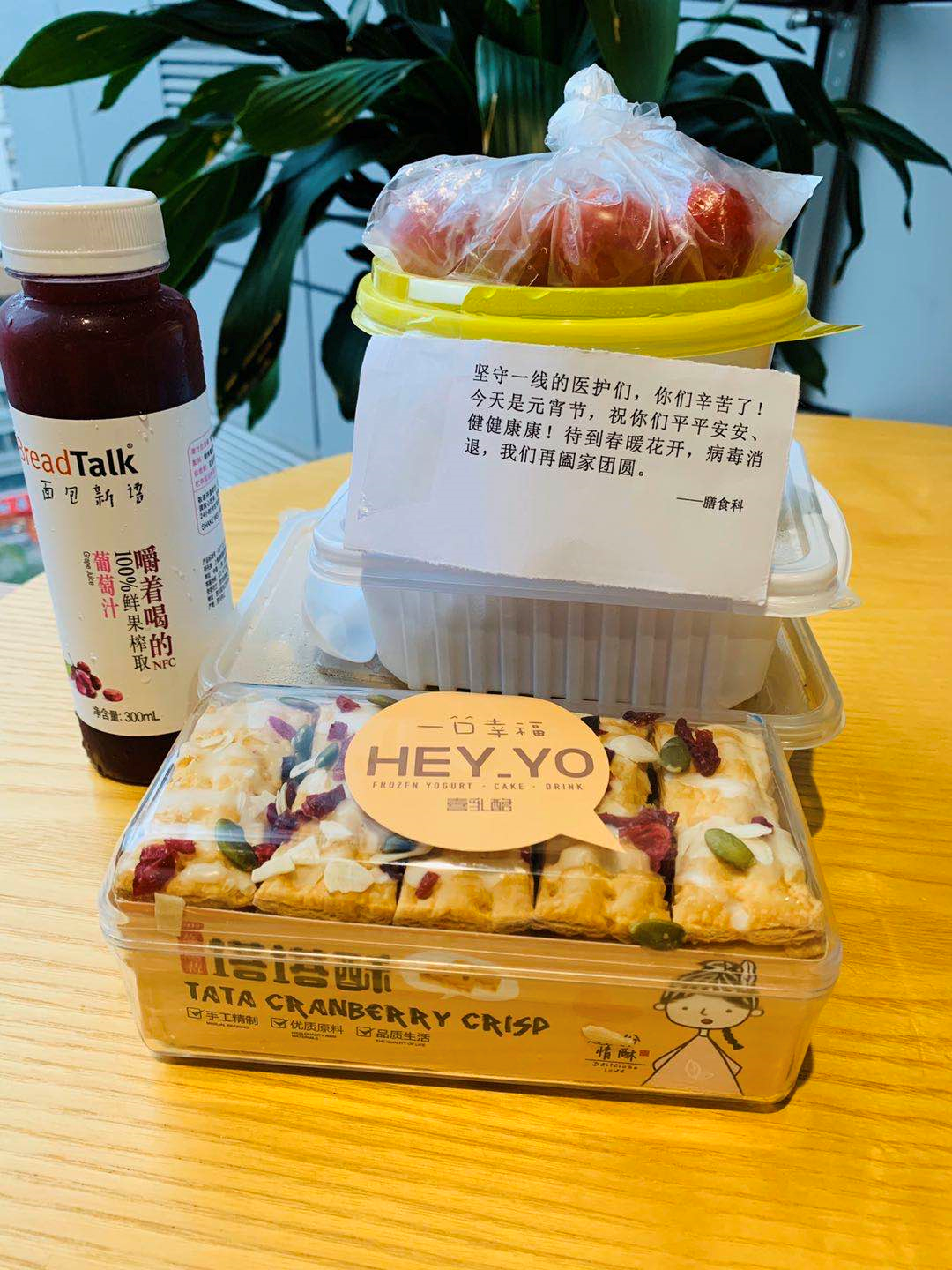 當天中午和晚上,發(fā)熱門診、感染科、隔離病房、檢驗科等一線的醫(yī)護人員,除了收到可口的飯菜外,還收到了一碗熱氣騰騰的湯圓。讓他們意外的是,湯圓盒上還貼了溫馨的字條,“堅守一線的醫(yī)護們,你們辛苦了!今天是元宵節(jié),祝你們平平安安、健健康康!待到春暖花開,疫情消退,我們再闔家團圓?!?/p>