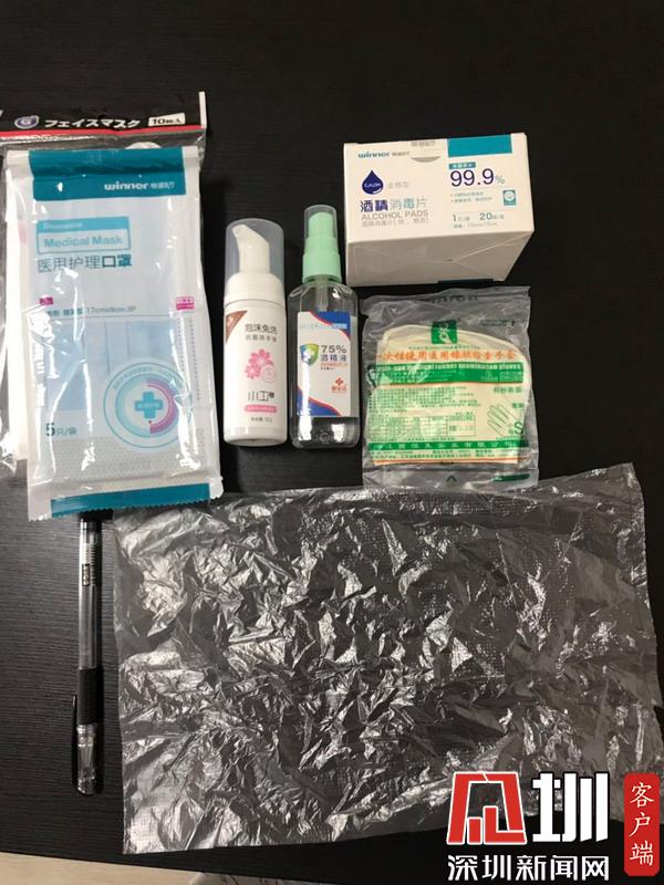 復(fù)工佩戴的物品:口罩、一次性手套、酒精消毒片、一支帶筆蓋的筆、工牌、手機(jī)都套塑料袋