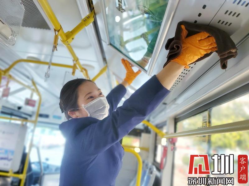 深圳巴士集團(tuán)四分公司工作人員對(duì)公交車(chē)進(jìn)行消毒擦洗。