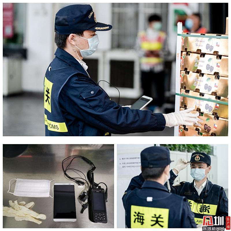 在文錦渡海關(guān)上班的祝子默開(kāi)始了他上崗的一天。在接受了口岸監(jiān)管場(chǎng)的體溫檢查后,他戴上口罩和手套,裝配上海關(guān)查驗(yàn)單兵設(shè)備,對(duì)進(jìn)口水果實(shí)施查驗(yàn)。