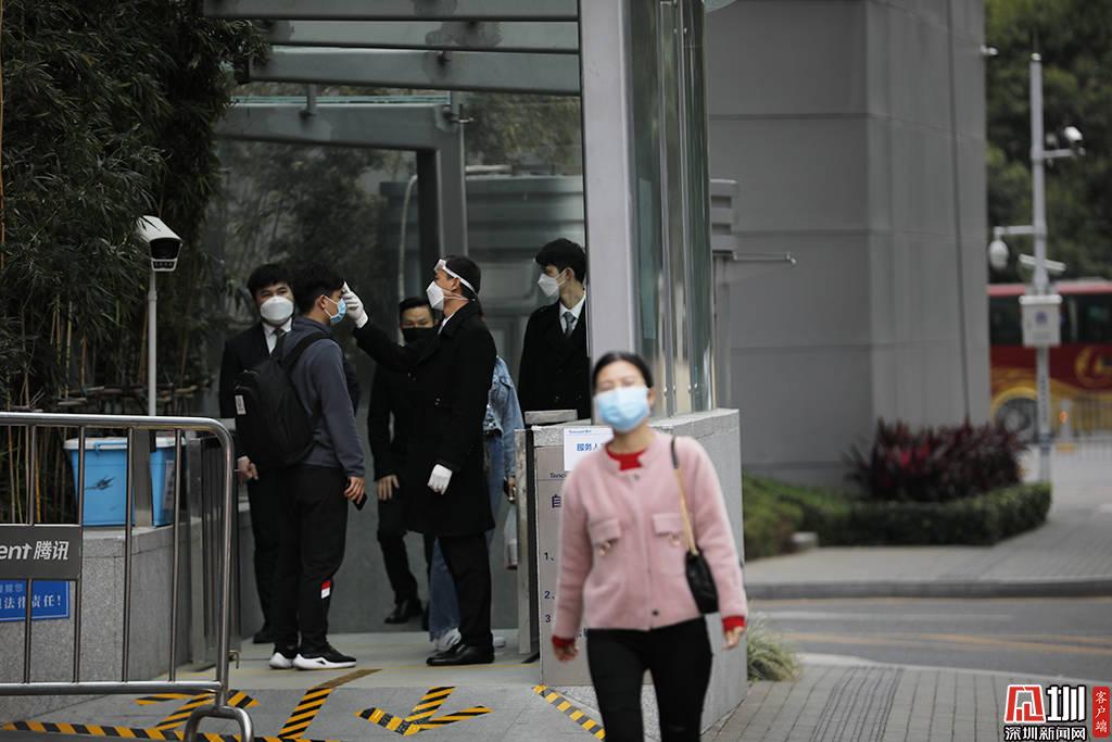 騰訊大廈的一個(gè)入口處,工作人員正在檢測體溫。