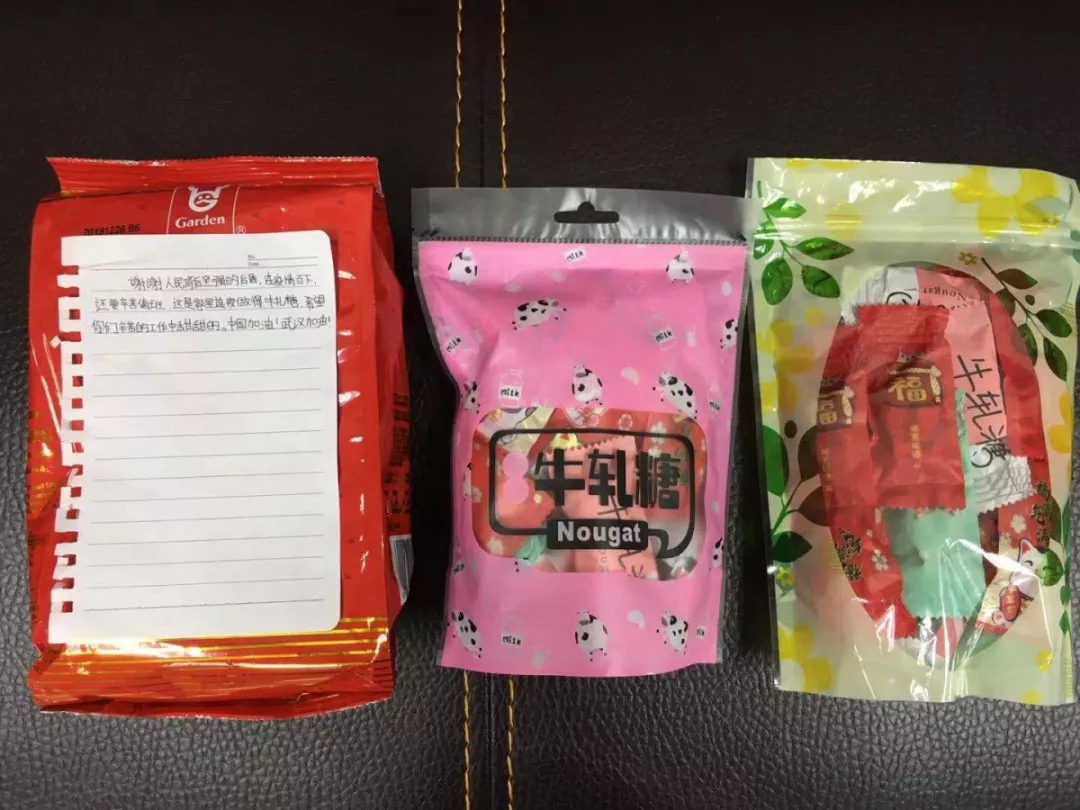 2月4日4時許,夜深人靜,深圳市公安局福田分局香蜜湖派出所收到了一份特殊的禮物:三袋還帶著余溫的暖心食品,還附著一張小紙條:“謝謝人民背后堅強(qiáng)的后盾,在疫情當(dāng)下,還要辛苦值班,這是家里連夜做的牛軋?zhí)?,希望你們辛苦的工作中甜甜的。中國加油!武漢加油!”這名熱心市民表示,上一次到派出所求助的時候就是深夜凌晨4點(diǎn)鐘,知道派出所的同志深夜的時候仍在辛苦值班,所以剛剛在家里做好了牛扎糖就迫不及待地馬上送來,希望派出所的同志趁熱吃一點(diǎn),暖暖身子。收到如此暖心的禮物,香蜜湖派出所對這位熱心市民表示衷心感謝!