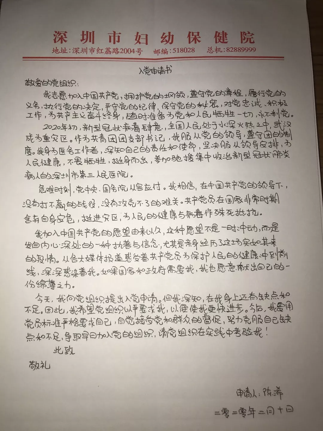 2月10日,陳浠在戰(zhàn)“疫”一線(xiàn)寫(xiě)的入黨申請(qǐng)書(shū)