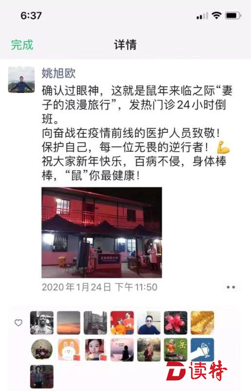 丘宇和姚旭歐兩人都是戰(zhàn)疫一線(xiàn)的衛(wèi)健系統(tǒng)雙職工,他們把對(duì)對(duì)方的關(guān)懷和愛(ài)意,在朋友圈表達(dá)得浪漫而動(dòng)人。