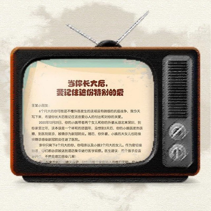 寶安區(qū)新安街道海富社區(qū)一名6個月大的孩子,因家里有人被確診為新型冠狀病毒感染的肺炎,被迫與家人分開進(jìn)行醫(yī)學(xué)觀察。海富社區(qū)工作人員們對其悉心照顧,如今孩子已經(jīng)平安度過了14天的居家觀察期。海富社區(qū)特意為孩子留下一封情真意切的書信,希望孩子長大后,能記住這段特殊時期收獲的特殊的愛。