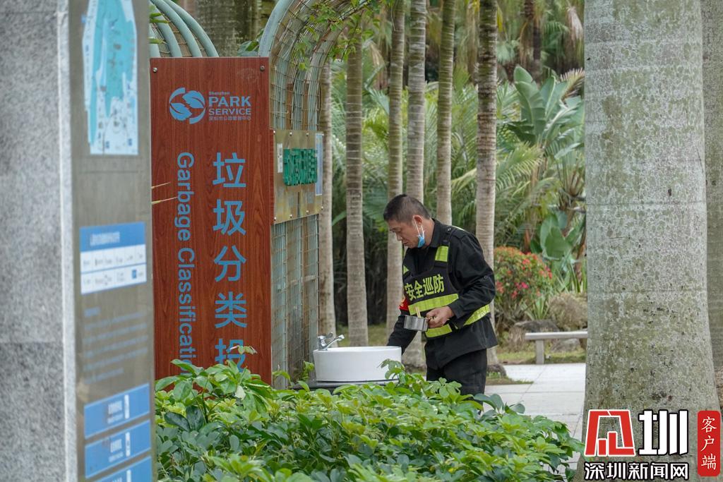 公園的安保人員似乎剛吃完飯,在刷碗