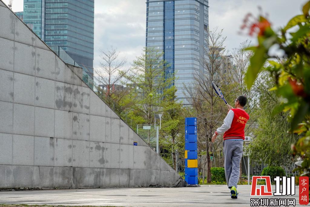 少年宮附近一位市民獨自對著墻壁練習網球