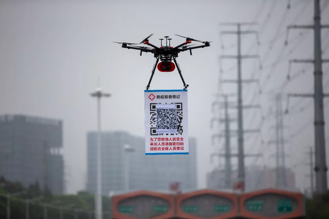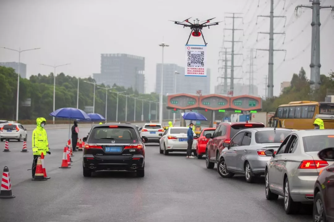 隨著返深車輛和人員的增加,深圳從8日開始啟用線上車輛申報(bào)登記。為提高申報(bào)效率,搭載喊話器、懸掛申報(bào)二維碼的無人機(jī)成為防疫一線工作人員的得力助手。民警操作無人機(jī)在車輛隊(duì)伍中穿梭,并通過喊話器提醒駕乘人員掃碼登記,減少人員接觸的同時(shí)提高了效率。