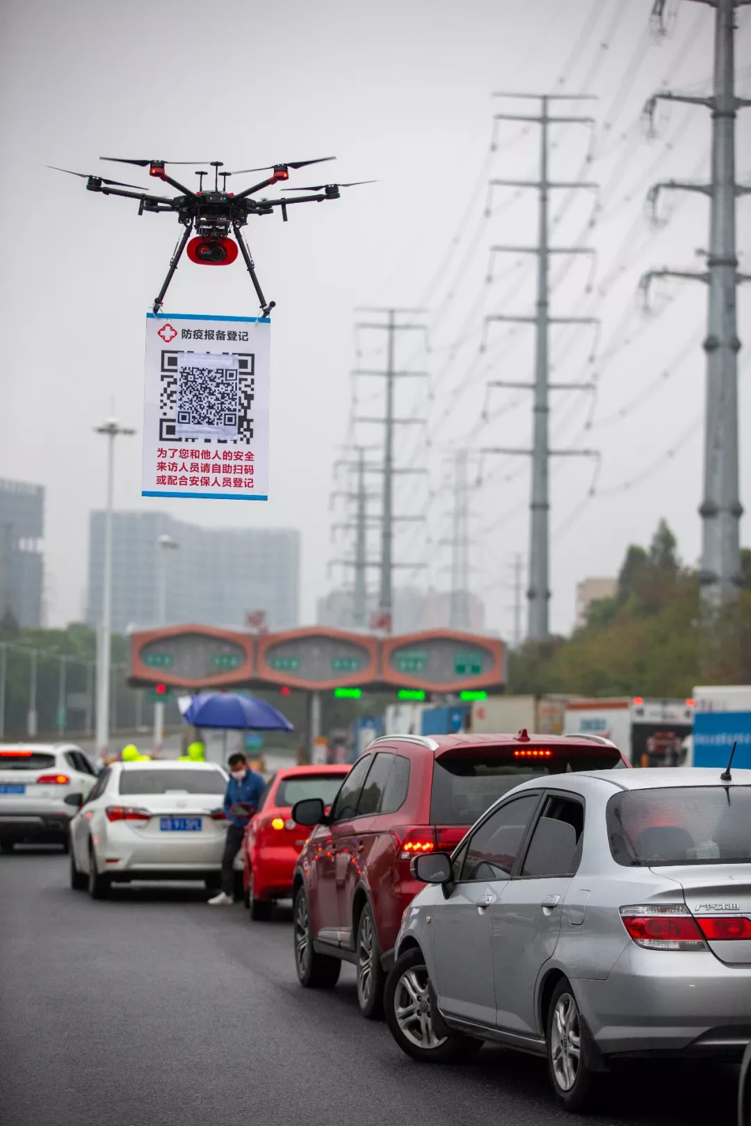 2月11日,在G94高速深圳觀瀾收費處,深圳龍華機(jī)訓(xùn)大隊無人機(jī)飛行隊的民警操作懸掛有申報二維碼的無人機(jī)在候檢的車輛間飛行。