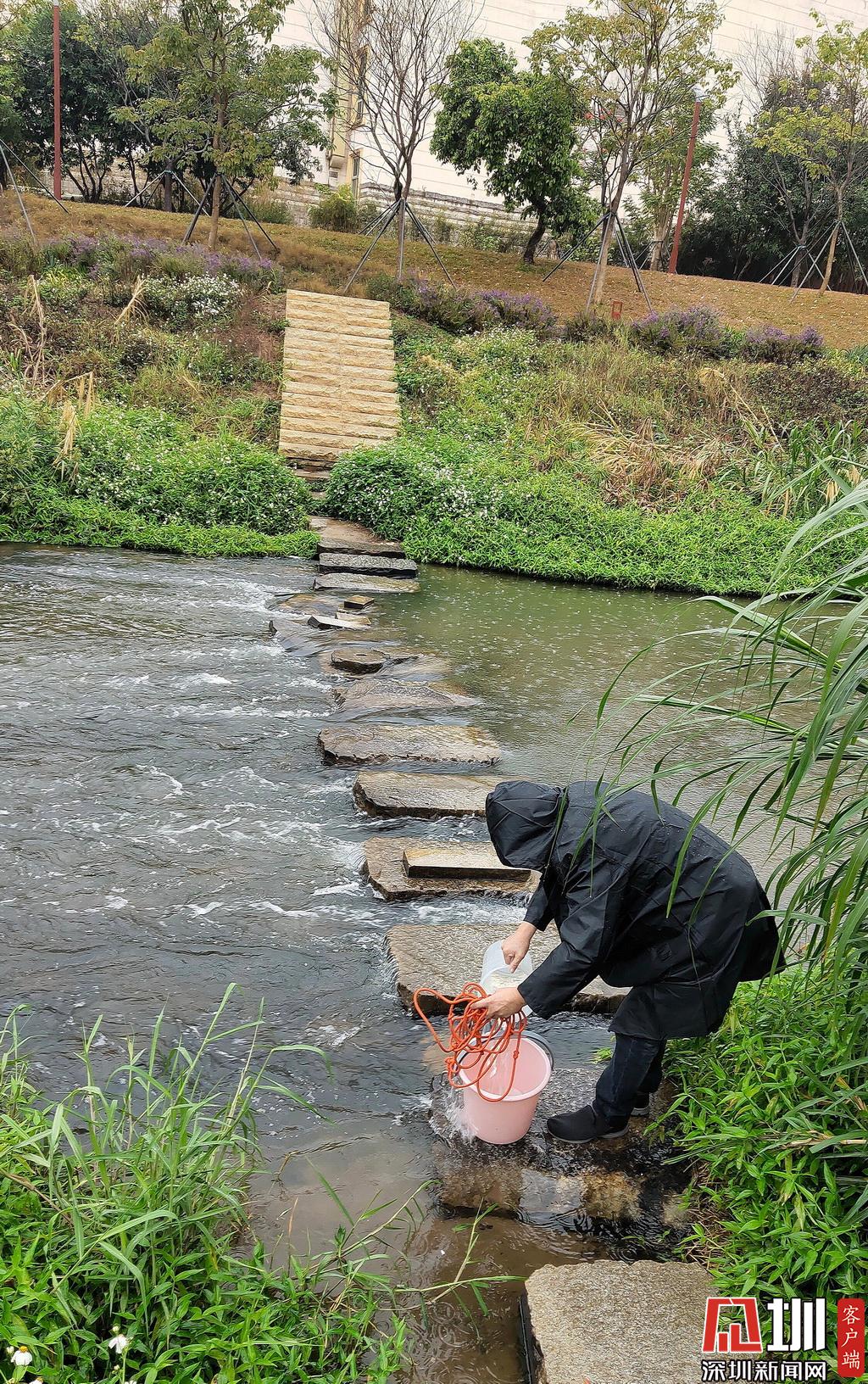 雨天,市環(huán)境監(jiān)測(cè)中心站的監(jiān)測(cè)人員在南山區(qū)大沙河取樣,進(jìn)行水質(zhì)監(jiān)測(cè)。