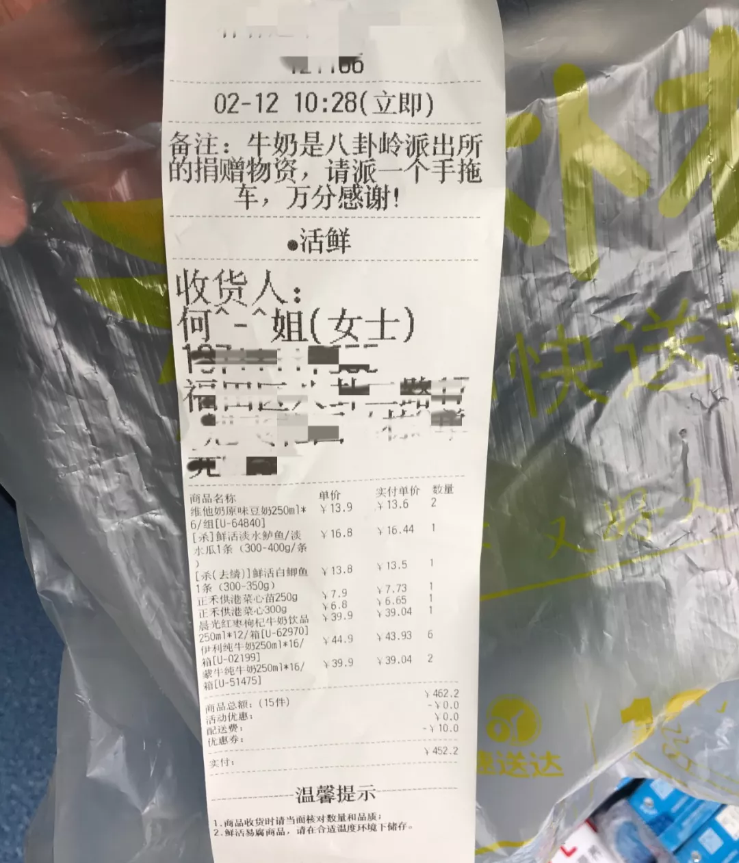 2月12日上午,一名群眾來到深圳市公安局福田分局八卦嶺派出所門口,送上防疫慰問物品。民警問及其姓名和聯(lián)系方式時,她只說:“民警的辛苦我們都看在眼里,這是我作為一名市民的心意和謝意。”便轉(zhuǎn)身離開了。民警在清點紀錄物資時,無意中發(fā)現(xiàn)了該熱心市民訂購物資的一張采購單,八卦嶺派出所全體警務(wù)人員在這里對不肯留名的何女士表示衷心的感謝!疫情無情、人民有情,溫暖警心、堅定前行!