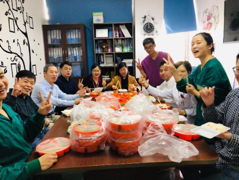 20:40,院領(lǐng)導(dǎo)和專家剛剛討論會(huì)診結(jié)束,病房同事也剛剛完成輪換交接。配餐室突然多了好多人,大家好像約好的似的,都不愿意回去自己過年。我們相聚一起,不分上下級(jí),我們只是一群同事(其實(shí),劉映霞副院長(zhǎng)也在)一起吃除夕工作餐,一起過大年。